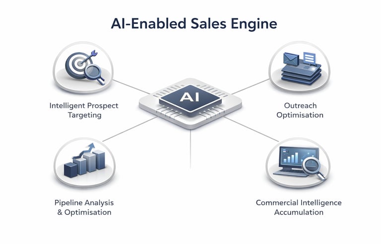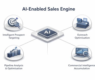 Our model combines experienced commercial leadership, elite sales talent, and AI-enabled infrastructure to support prospect targeting, outreach optimisation, pipeline visibility, and continuous performance improvement.